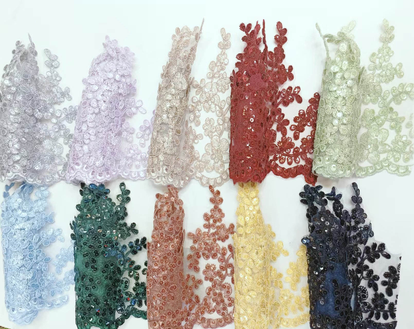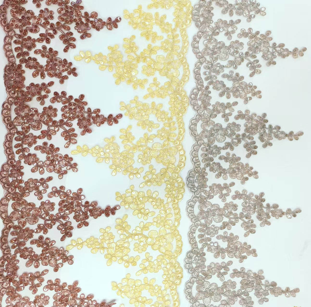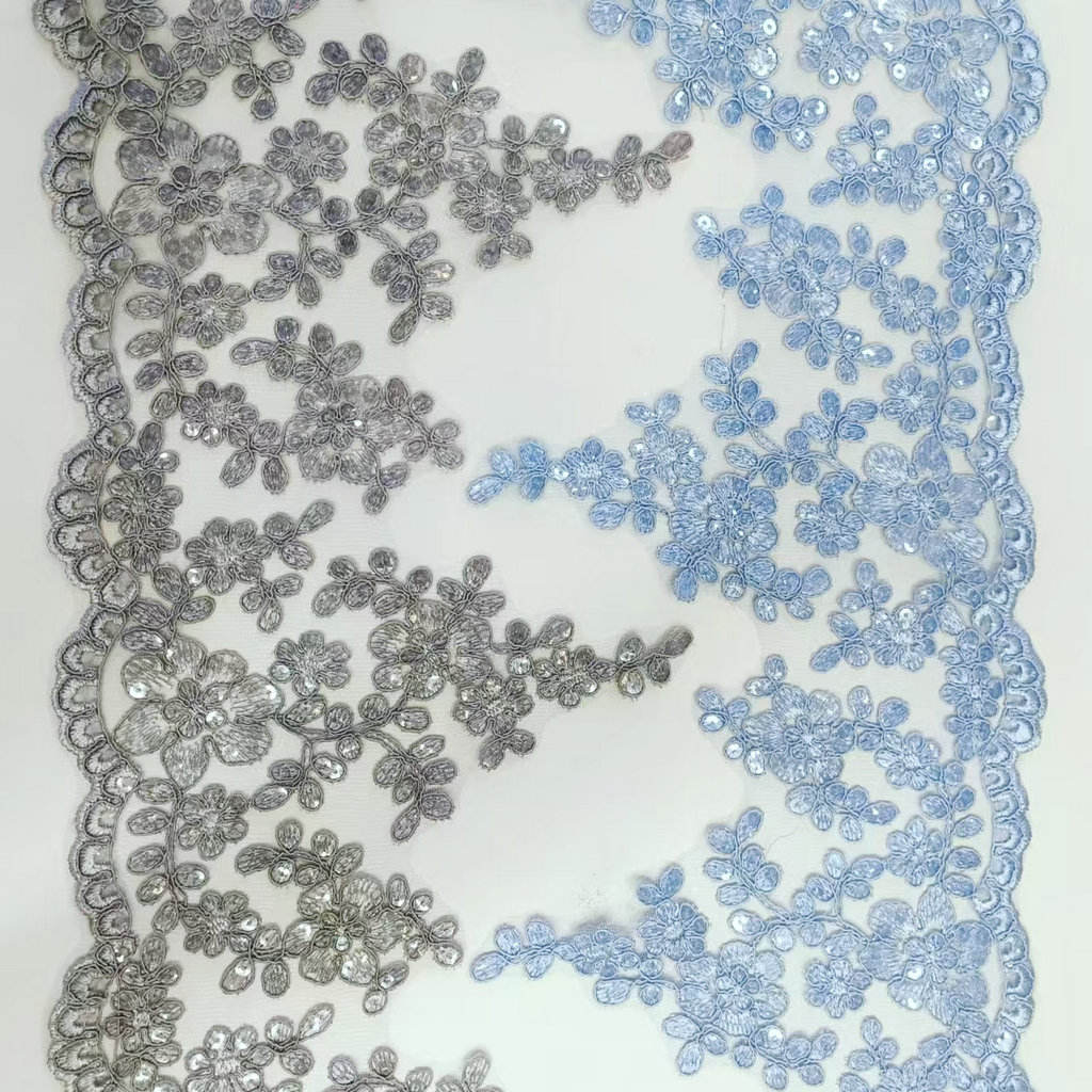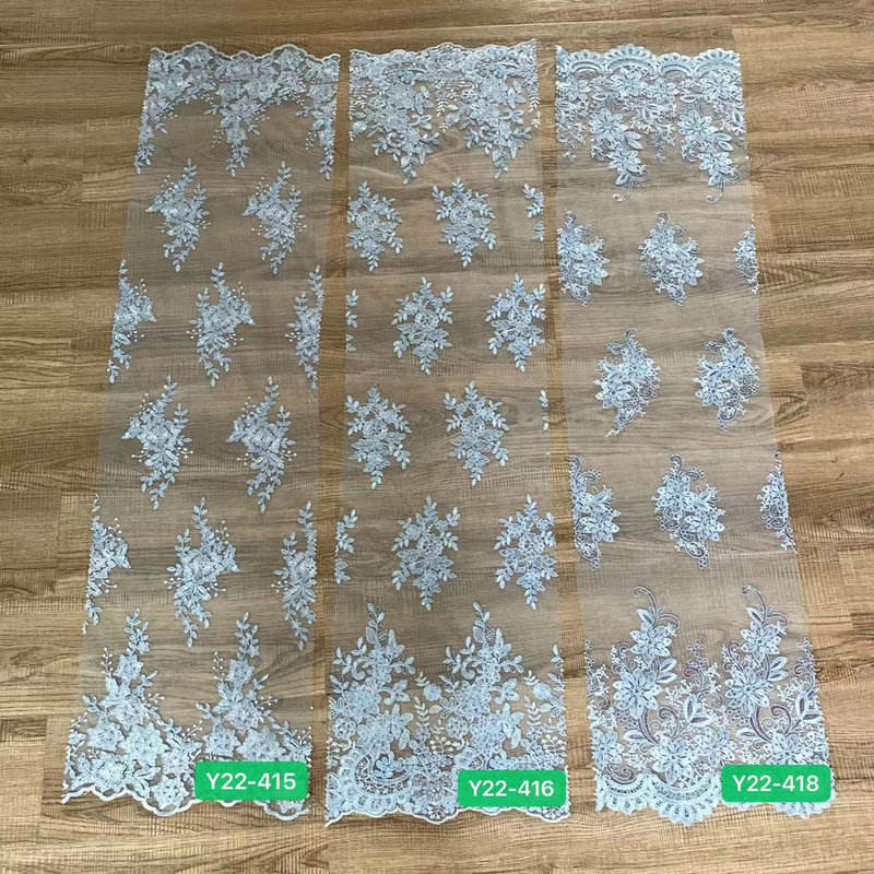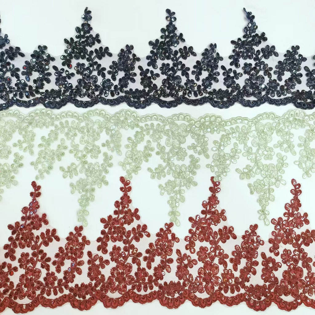 Луксозна булчинска френска дантела пайети сватбена рокля гранична дантела за сватбена дантела, включваща френска дантелена основа от висок клас, ръчно зашити лъскави пайети, моделите са изящни и триизмерни, с лека и гладка текстура. Декорации от висок клас, специално създадени за сватбени рокли и вечерни рокли, предлагани в бяло от слонова кост, злато на шампанското и други тонове, поддържайте ширина и шарки по поръчка, подчертавайки луксозен и романтичен стил
