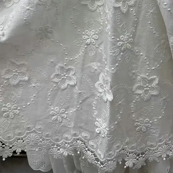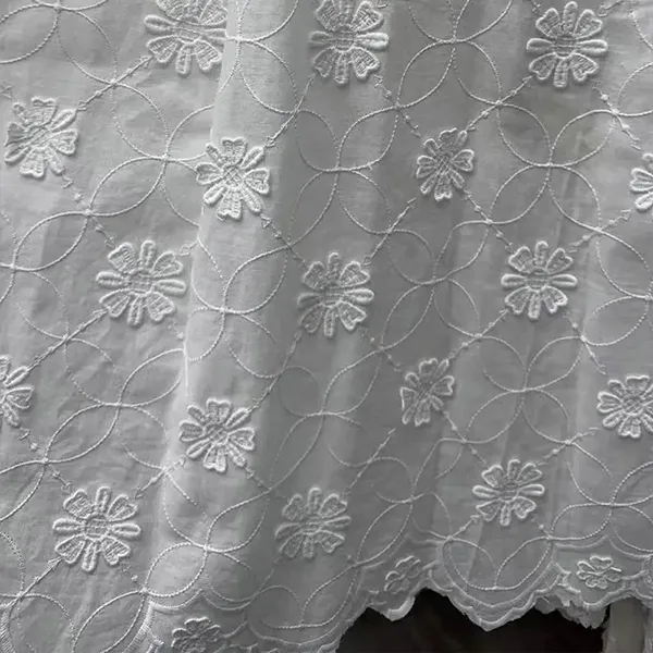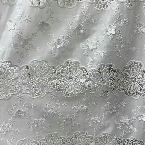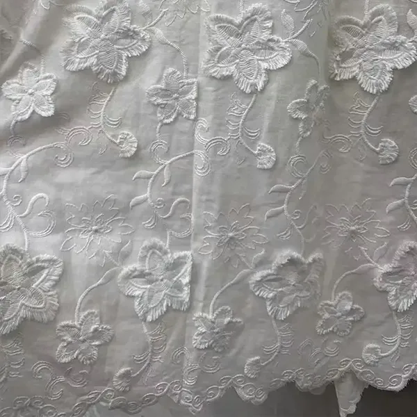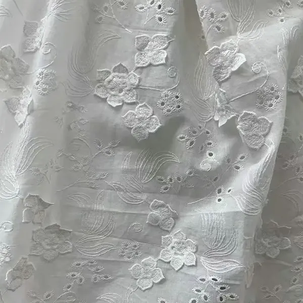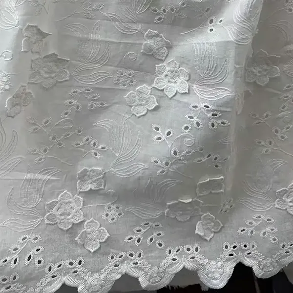 3D цветна декорирана 100% памучна бродерия дантелена тъкан с дупки за очи, включващи повдигнати 3D флорална бродерия и деликатна резачка за очи, тази 100% памучна дантела предлага дишаща елегантност за булчинско облекло, рокли и блузи. Размерните дизайни създават луксозна текстура, като същевременно поддържат мекота и драпиране. Перфектен за романтична, вдъхновена от реколта мода.